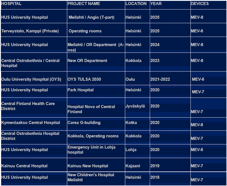 Finnish hospitals still have older generations of equipment, such as MEV-4, in their operating rooms. This shows that our MEV system is durable, reliable, and long-lasting. Constant quality control and meticulous manufacturing ensure the quality and reliability of our equipment.