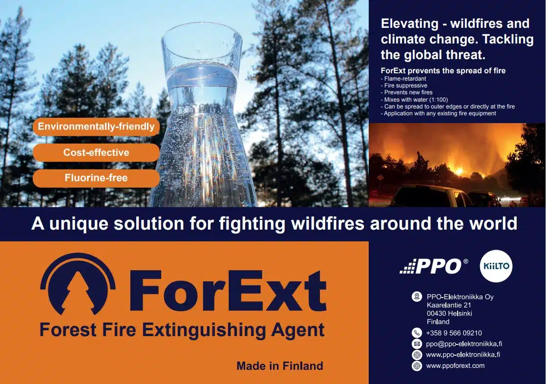 PPO® ForExtin (= Forest Fire Extinquishing Agent).  Ratkaisumme parantaa huomattavasti sammutustehoa, säästää vettä ja sopii kaikkiin käytössä oleviin suuttimiin tukkimatta niitä.
